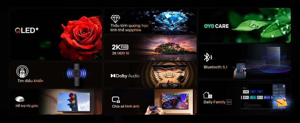 Tính năng | Hệ điều hành Google TV Điều Khiển Giọng nói không cần remote Màn hình tràn viền 4.0 HDR 10 , Game mode Lọc ánh sáng xanh Chống Nhấp Nháy Tìm kiếm điều khiển TV |