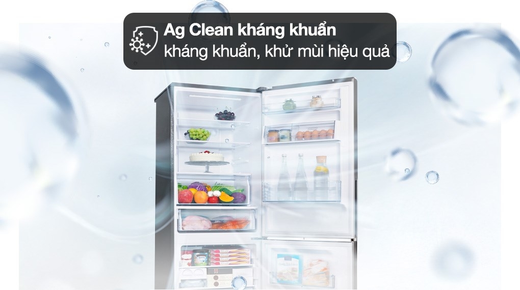 Bộ lọc Ag tích hợp ion bạc có khả năng ức chế đến 99,9% vi khuẩn và nấm mốc, đồng thời loại bỏ mùi hôi khó chịu, giữ cho không gian bên trong tủ lạnh luôn sạch sẽ và tươi mát.